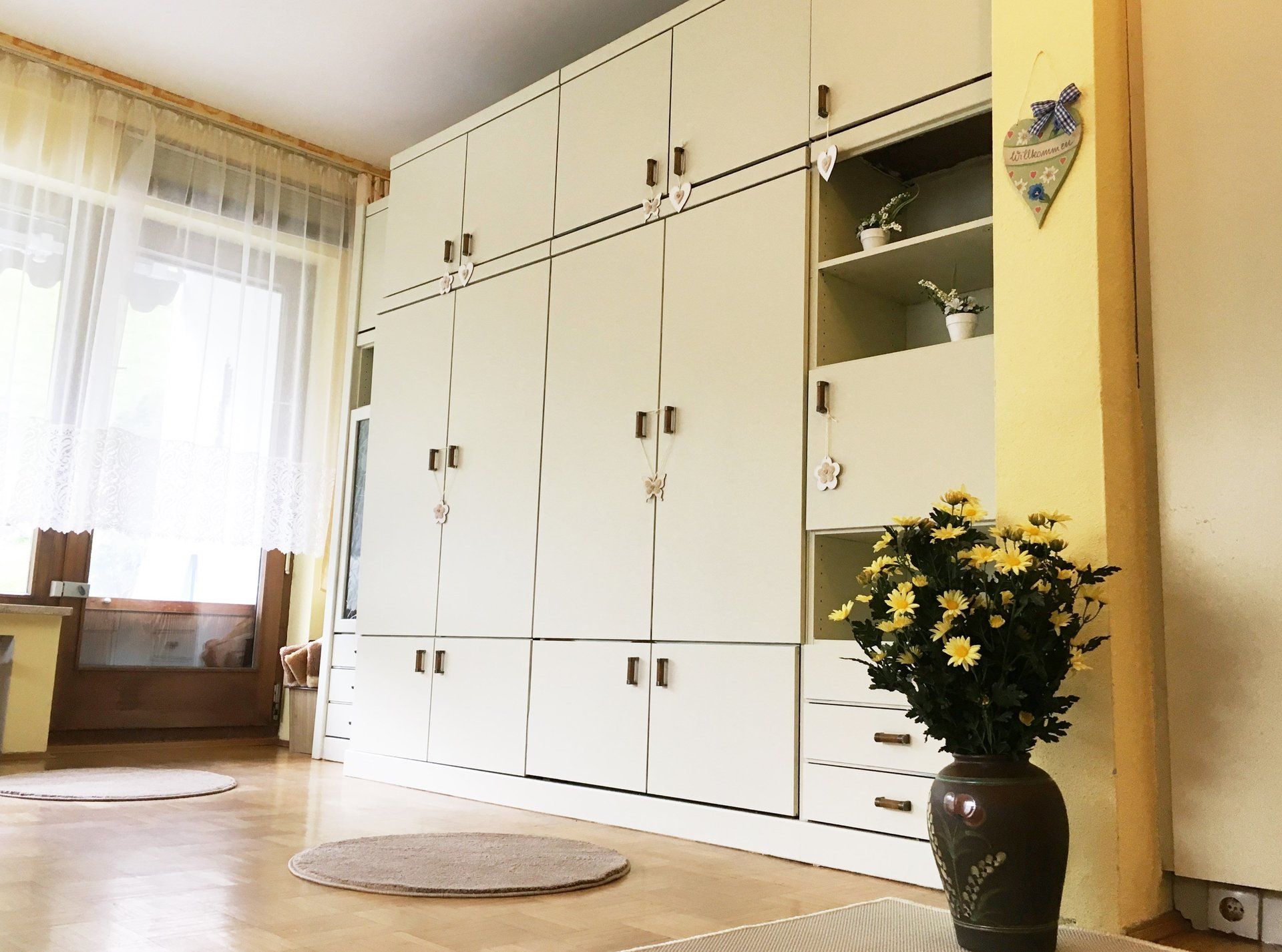 Ein helles, geräumiges Wohn-Schlafzimmer mit Schrankbett zum Einklappen und großen Fenstern, separater Küche, Badezimmer mit WC und Dusche.