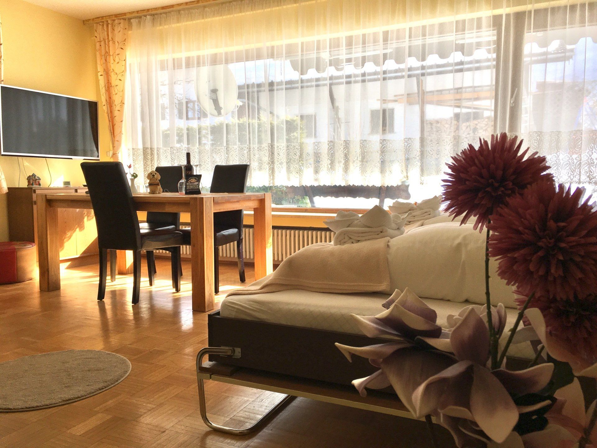Helle Einraumwohnung in ruhiger Lage mit eigener großer Sonnenterrasse, mit wunderschönem Gebirgsblick, 40 qm! Sehr gemütliche, praktisch eingerichtete Einraumwohnung im EG mit Geschirrspüler.