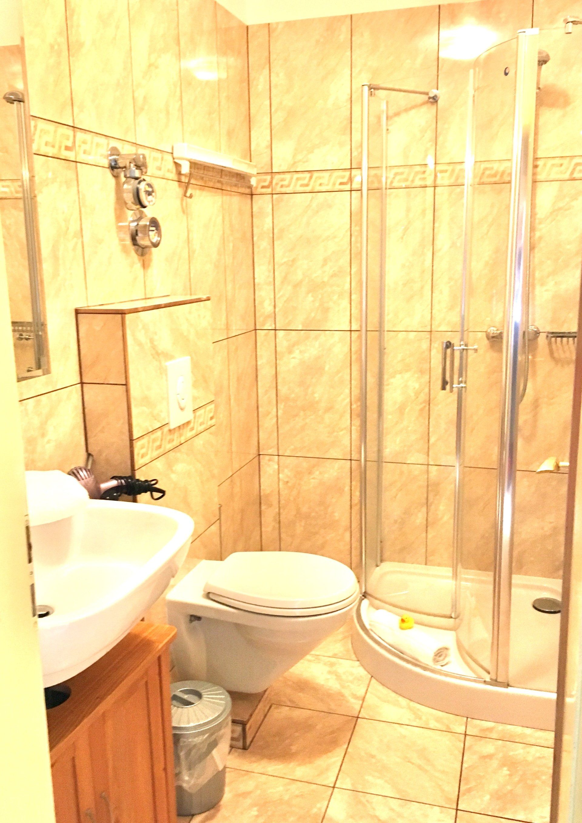 Spacious, bright combined sitting-bedroom including fold-away bed, big windows, separate, full equipped kitchen with a dish washer and bathroom with a shower.